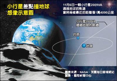 自由时报报道,2009VA 是在距离地表一万四千公里处擦过地球,这是目前已知第三近的距离,而过去行星擦过地球距离最近的前两名,分别是二○○八年十月九日,在地表六千一百五十公里外通过地球的2008 TS26,以及二○○四年三月三十一日,在距离地表六千五百三十五公里处扫过的2004FU162。每年大约有两颗像2009VA这种尺寸的小行星擦过地球,而小行星撞击地球,大约每五年发生一次。