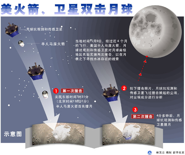 美航天局发表新闻公报说,半人马座火箭、月球坑观测和传感卫星10月9日相继撞击了月球南极附近的凯布斯坑,重约2.2吨的半人马座火箭撞月后激起了两部分尘埃:一部分由蒸汽和微尘组成;另一部分由质量更重的物质组成。月球坑观测和传感卫星携带的光谱仪对尘埃进行了分析。