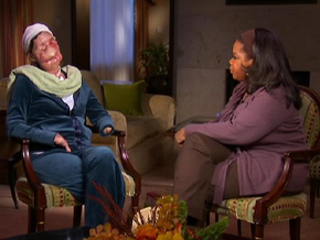洽拉·纳什8个月前遭到一只疯狂的黑猩猩袭击,脸上大部分皮肤都被撕下来了,这是她8个月以来首次面对镜头。在接受奥普拉·温弗瑞的专访时,纳什打破了沉默,在摄像头面前向观众展示了那张被毁的脸。在场的观众看到后非常震惊,主持人也连连表示她从来没有见过这样可怕的脸,即使任何烧伤的受害者都不至于伤到如此程度。