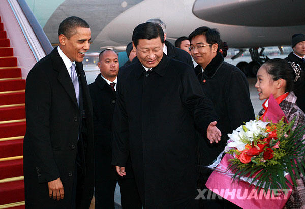 11月16日下午,美国总统奥巴马乘专机从上海飞抵北京,国家副主席习近平前往北京首都国际机场迎接。新华社记者 庞兴雷 摄 新华网北京11月16日电(记者孙奕)应国家主席胡锦涛邀请,美国总统奥巴马16日下午乘专机从上海飞抵北京,继续对中国进行国事访问。国家副主席习近平前往机场迎接。 下午4点50分许,奥巴马乘坐的专机抵达北京首都国际机场。 前来迎接的习近平在舷梯旁与奥巴马亲切握手致意。一名中国女孩向奥巴马献花。 前来机场迎接的还有外交部长杨洁篪、中国驻美国大使周文重等官员。 奥巴马主要随行人员美国驻华大使洪博培、国务卿希拉里·克林顿、常驻联合国代表苏珊·赖斯、总统国家安全事务助理詹姆斯·琼斯等同时抵达。 17日上午,胡锦涛主席将在人民大会堂主持欢迎仪式,欢迎奥巴马总统访华。欢迎仪式后,两国元首将举行会谈,就中美关系和共同关心的重大国际与地区问题深入交换意见。在京期间,奥巴马还将参观故宫和长城。
