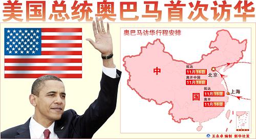 奥巴马这次备受关注的访问将一直延续到18日。到访上海、北京两地,政治活动、文化交流活动相交织,日程紧密。其中最受关注的无疑是胡锦涛主席和奥巴马即将举行的政治会谈。