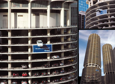将一辆真正的汽车半悬挂在芝加哥市中心著名的地标,Marina Towers的外墙上,如此危险,还是来买汽车保险吧。