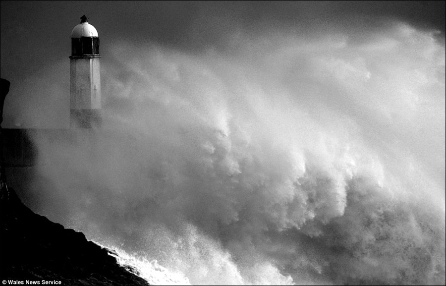 巨浪带着数千吨的海水冲击海墙,巨大的水花直溅向天空