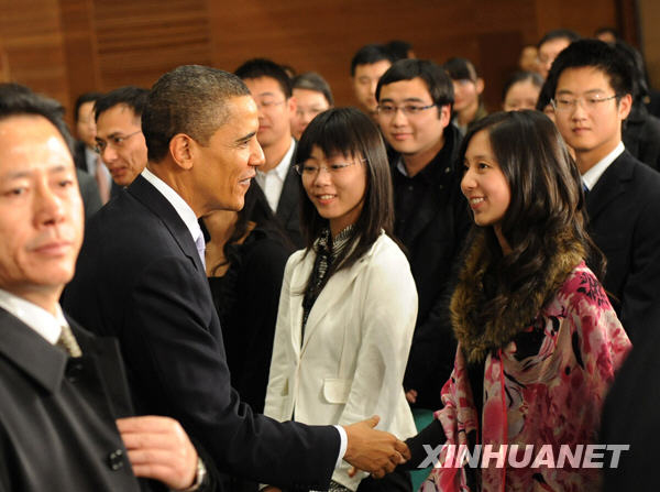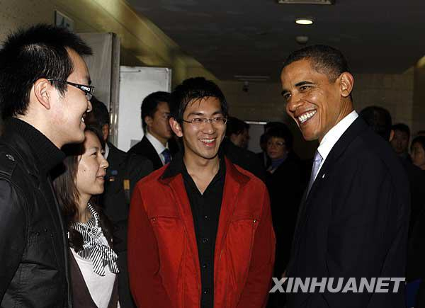 11月16日,美国总统奥巴马在上海科技馆与中国青年对话。这是奥巴马演讲前与学生交流。新华社记者 张明 摄