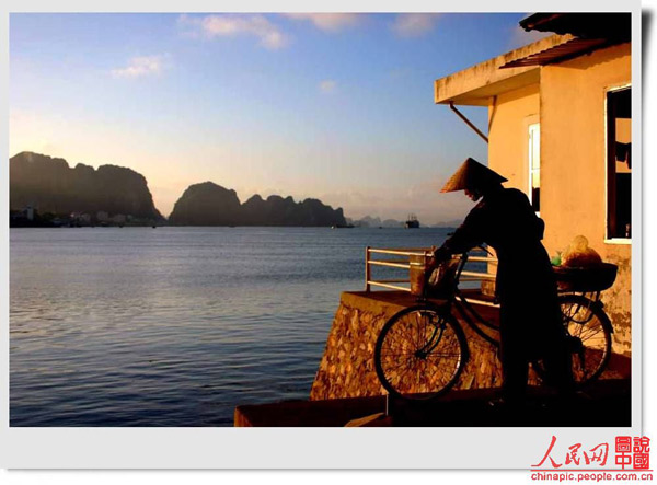 在晨光下,来自农村的小贩的剪影吸引了我,我很喜欢海防这样宁静的早晨。