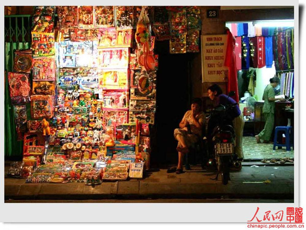夜幕下的街市。河内的老街很有特点,据说有三十六条街,每个街都聚集着买买着一类特色的商品,如瓷器、塑料、布匹等。