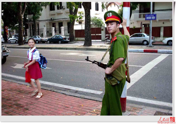 这位小帅哥是河内使馆区守卫的兵哥哥,他的任务当然是保卫使馆区的安全,起初他看见咱的相机伸手制止我拍摄,但随后我还是拍下了这一张,那上课去的女孩看见也笑了,自然他也没说啥,可见还是挺随和的。