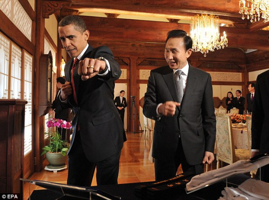 双方会晤之后,李明博将一套跆拳道制服和一条黑带作为礼物赠予奥巴马,奥巴马随即摆开跆拳道姿态,大展拳脚,韩国总统李明博在一旁赞赏不已。据悉,2001年,奥巴马还是伊利诺伊州一名参议员时,就开始了为期4年的武术学习。