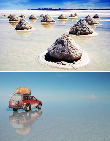 当驱车经过世界上最大的盐沼玻利维亚的乌尤尼盐湖时,你可能会有种虚无缥缈的感觉。阳光在巨大的盐湖上反射,让人感觉天地融为一体。工人正将等待处理的盐堆成圆锥状。进入盐沼,感觉就像进入了世外桃源。乌尤尼盐沼含盐量在100亿吨左右,但是每年只提取约2.5万吨盐。