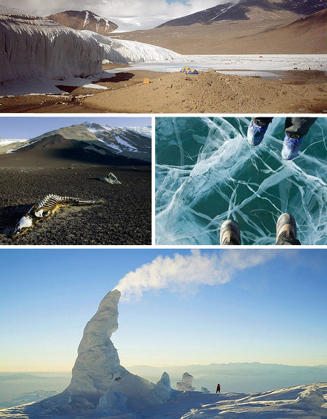 干谷是非常奇特的地方,虽然它地处南极洲,但是几乎没有降雪。干谷位于麦克默多海峡以西的维多利亚地境内。广袤的沙土,常年风吹形成的怪异的岩石雕刻以及火山排气孔使这个地方看起来犹如梦幻一般。
