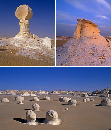 高耸的白垩岩层屹立在埃及白沙漠中,仿佛巨大的蘑菇群。它其实由数千年沙暴“雕刻”而成。白沙漠位于埃及西部法拉法拉绿洲,这个奇特的景观是一个野营和旅游的好地方。