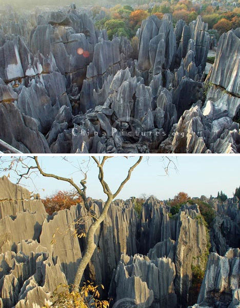 云南当地有谚语:不到石林,枉来云南。这里有400平方公里壮丽的石林仙境。岩石群拔地而起,高高耸立,犹如一颗颗大树。石林所处的地方在3亿多年前曾是大海,海水逐渐回落,岩床被慢慢侵蚀,最后形成现在的形貌。