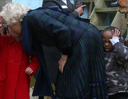 11月19日似乎是卡米拉的“黑色星期四”,在一天之内频频出丑,首先是用屁股不小心撞到一个3岁男童的脑袋,这个小男孩很不给面子,当场哇哇大哭;接着在出席圣诞灯饰雕像的亮灯仪式时,她又因用力过猛,竟然将绳子拉断。