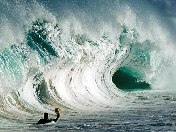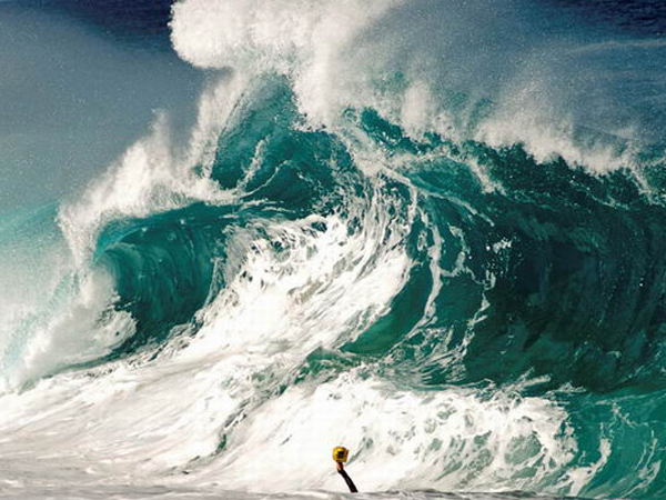 这张照片中,克拉克面对着巨浪,临危不惧,手持防水照相机,在千钧一发之际,抢拍管型巨浪的内部风景