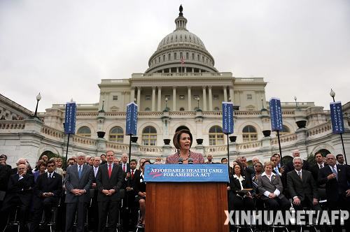 资料图片:10月29日,美国众议院议长佩洛西在华盛顿国会山召开新闻发布会,宣布推出统一版本的医疗改革议案。据悉,这份议案是众议院3个委员会提出医改方案的综合。如果获批,预计在未来10年内耗资8940亿美元,但会使大约3600万目前没有医疗保险的人获保,医保覆盖面达到总人口的96%,并将使联邦政府斥资减少约3000亿美元。美国总统奥巴马当天发表声明,表示对众议院推出的这份议案感到满意。新华社/法新
