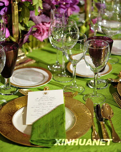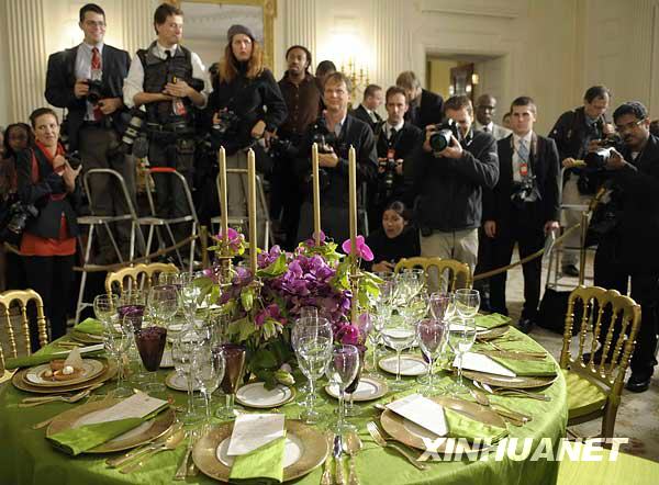 11月24日,在美国首都华盛顿白宫国宴厅,工作人员摆设国宴桌台。当晚,美国总统奥巴马和夫人米歇尔·奥巴马将在此款待到访的印度总理辛格。在宴会开始前,第一夫人米歇尔·奥巴马及白宫的工作人员向应邀前来的10余名美国普通女学生展示了美国国宴的准备程序,并讲述其历史传统。 |
