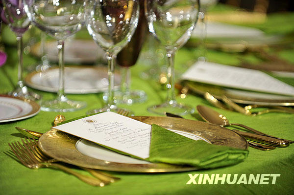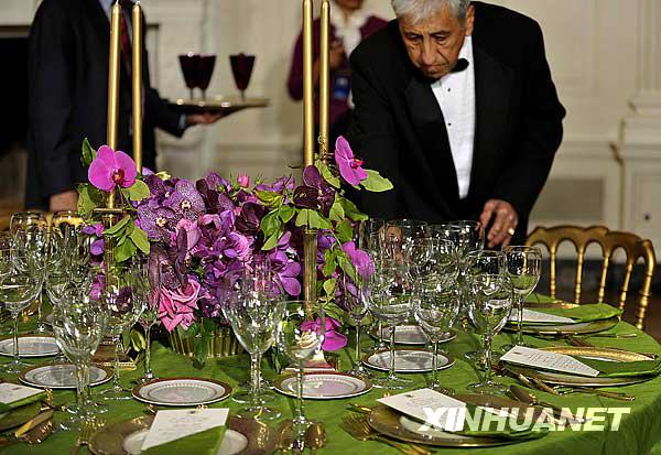 11月24日,在美国首都华盛顿白宫国宴厅,工作人员摆设国宴桌台。当晚,美国总统奥巴马和夫人米歇尔·奥巴马将在此款待到访的印度总理辛格。在宴会开始前,第一夫人米歇尔·奥巴马及白宫的工作人员向应邀前来的10余名美国普通女学生展示了美国国宴的准备程序,并讲述其历史传统。新华社记者张岩摄