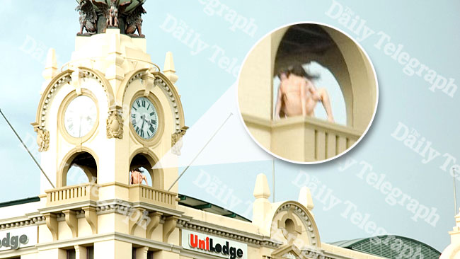 上周五下午3.30分,一对年轻情侣裸体在悉尼市悉尼大学附近百老汇购物中心旁的标志性钟楼建筑上做爱,被附近等车的路人偷拍正着。
