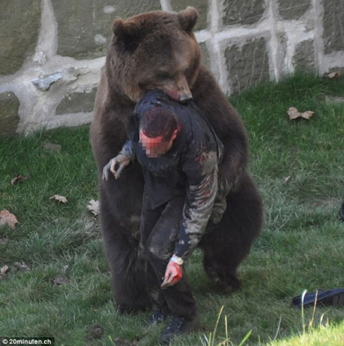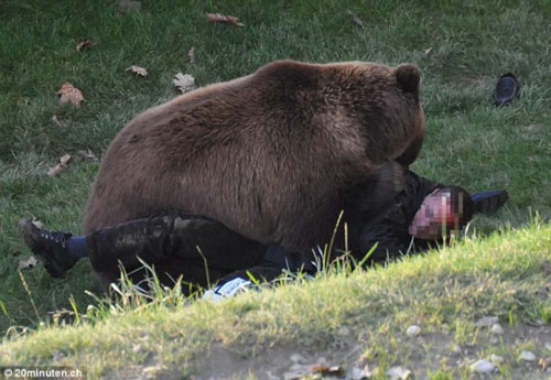 在瑞士首都伯尔尼熊公园里,一名患有智力障碍的游客突然掉进了棕熊围栏里,体型硕大的棕熊立即对这名游客进行猛烈攻击。这惊险一幕正好被英国游客布鲁克斯拍了下来。11月24日,布鲁克斯公布了这一组照片。