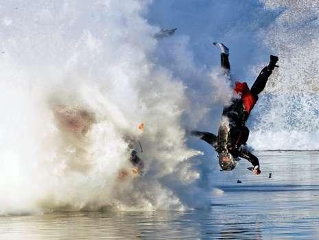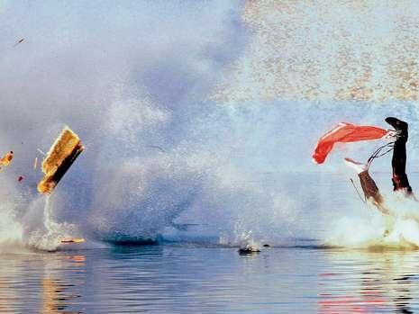 突然间,赛艇发生爆炸!选手奈特倒立着被崩到空中