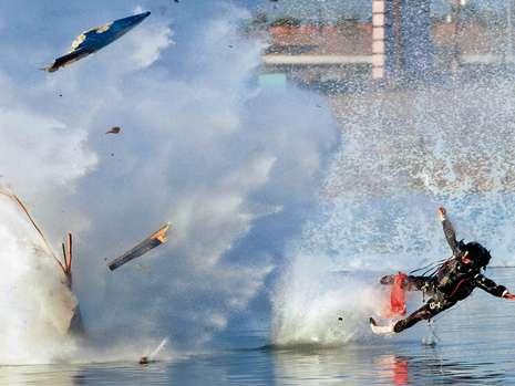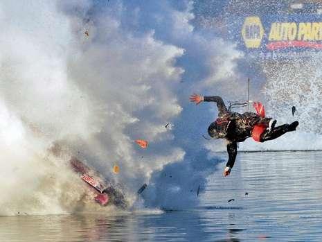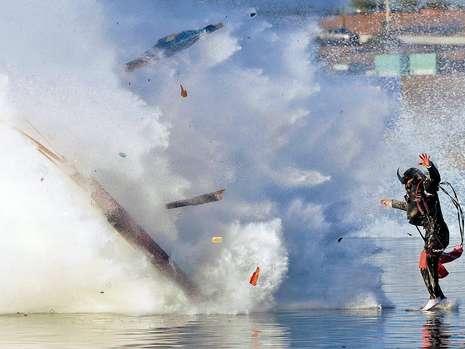 奈特所经历的一切看起来就像是动作影片中的特技场景!一开始,他的赛艇出了故障,左右摇晃起来。正在奈特检查设备的时候,赛艇突然爆炸,巨大的冲击波将奈特吹到空中,并落到水里。幸运的是,奈特奇迹般生还!