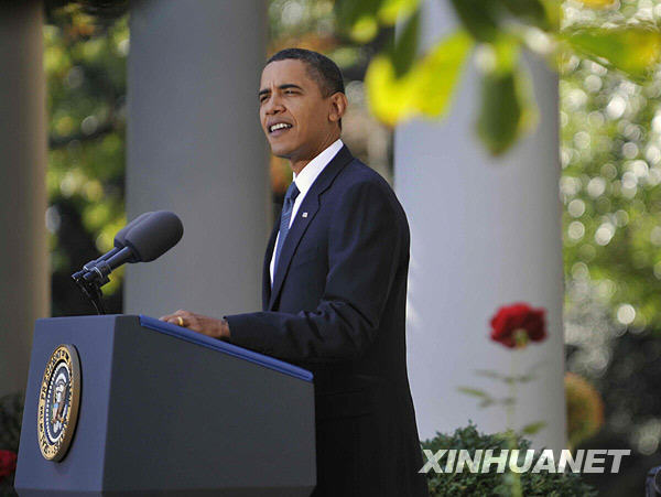 资料图片:10月9日,美国总统奥巴马在白宫玫瑰园发表讲话。当日,奥巴马荣获诺贝尔和平奖。新华社记者张岩摄