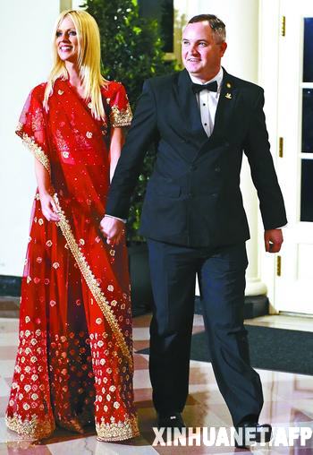 11月24日,萨拉希夫妇走进白宫,出席为印度总理辛格举行的国宴。新华/法新