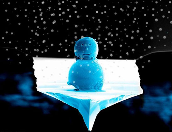 虽然在蓝光下放大后看起来与孩子堆的雪人没什么两样,但这个杰作却是运用高科技设备打造的产物。世界最小雪人由两个微型锡珠构成,这种锡珠通常被用于校准电子显微镜镜头。借助于能够操纵纳米粒子的工具,科学家将两个锡珠组合在一起,并用微型铂沉积物进行焊接。雪人的眼睛和笑容使用一道聚焦的离子束雕刻而成,由铂制成的鼻子也同样借助离子束进行安装。