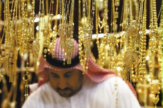 投资人前仆后继地买进,推动黄金价格2日再创空前新高。图为沙乌地阿拉伯的利雅德一家金店,店内满是金饰,生意很好。