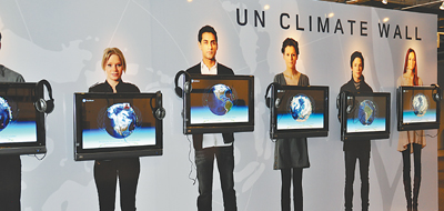 在丹麦首都哥本哈根贝拉会展中心布置的“联合国气候墙”。本报记者 辛本健摄