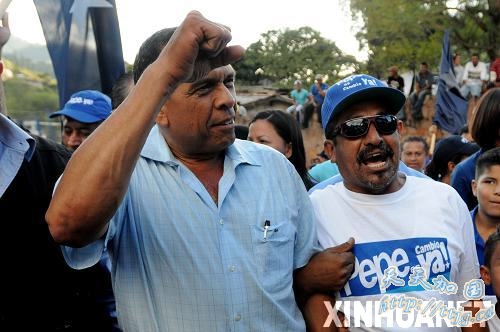 资料图片11月29日,洪都拉斯国民党总统候选人波尔菲里奥·洛沃(前左)在首都特古西加尔巴与支持者见面。洪都拉斯最高选举委员会29日晚公布的初步计票结果显示,该国主要反对党国民党候选人波尔菲里奥·洛沃在总统选举中获胜。新华社发(海罗·卡伊纳摄)