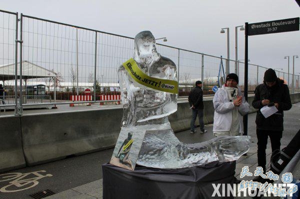 12月7日,德国环境与自然保护联盟(BUND)把冰塑造成美人鱼的形状,摆在会场外面,"冰美人鱼"融化促使大家思考,给人警醒。何钢摄