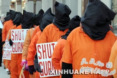 1月14日,在美国首都华盛顿,抗议者装扮成美国设在古巴的关塔那摩监狱中囚犯的样子,呼吁美国政府关闭关塔那摩监狱。新华社/法新