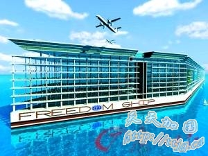 最引人注目的是在“自由之船”的顶端,有一个大型机场跑道,可供多架直升机、甚至小型民航班机同时起飞降落。