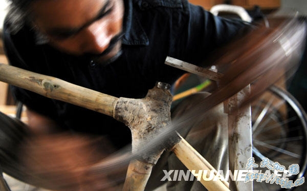 32岁的维贾伊·夏尔马是一名木匠,同时他也是一名自行车爱好者。他用竹子代替钢管制造出了环保自行车。新华社/法新