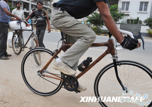 12月16日,印度人维贾伊·夏尔马在班加罗尔试骑他自己用竹子作骨架制造的自行车。新华社/法新