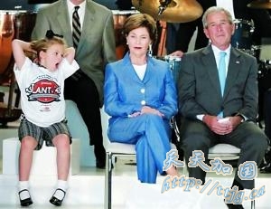 9月21日,在得州北部的牛仔体育场,布什夫妇参加一个社区服务项目,正在听发言的布什发呆的样子,与左边一名伸懒腰打呵欠的8岁小女孩相映成趣。