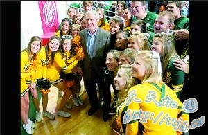 1月20日离任后一周,他和夫人劳拉做的第一件事是在家乡观看全美大学生篮球赛的女篮比赛,球赛上半场后,小布什和贝勒大学的啦啦队合影。