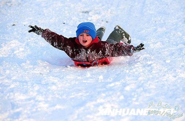 英国肯特郡的塞文欧克斯的一个公园里,一个孩子用雪橇滑雪
