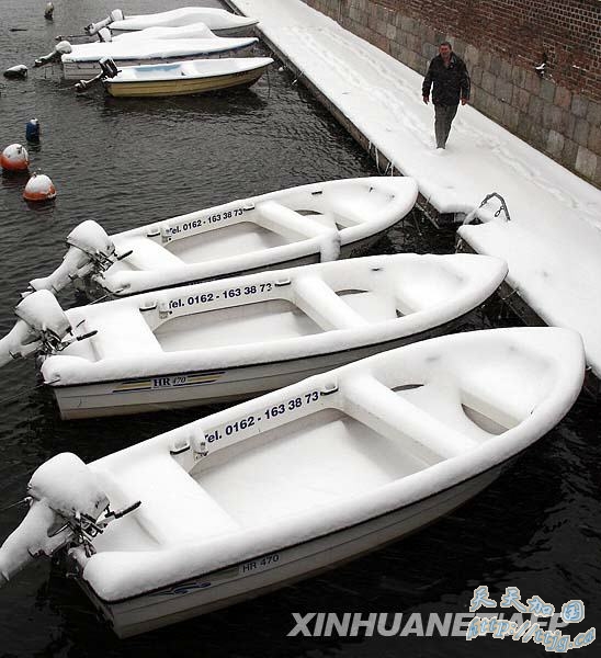 12月18日,在德国北部城市施特拉尔,一名男子经过被白雪覆盖的小船。