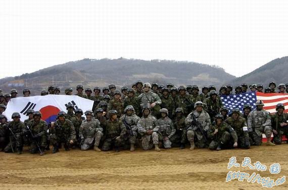美韩军队在联合军演完毕后合影留念。 [图片来源:环球网]