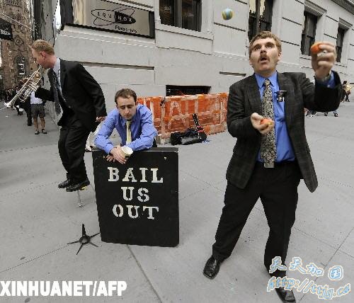 资料图片:2008年10月13日,在美国纽约的华尔街,几名失业的金融业从业人员在街头卖艺挣钱。 新华社/法新