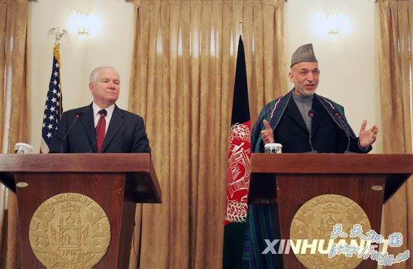 资料图片:12月8日,阿富汗总统卡尔扎伊(右)与美国国防部长罗伯特·盖茨在阿富汗首都喀布尔举行联合新闻发布会。盖茨于当天突然造访阿富汗。新华社记者扎比摄