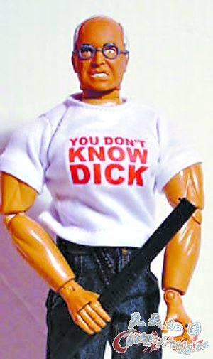从玩偶外形看,副总统迪克·切尼四肢发达,体型魁梧,上穿一件印有红色“你不知道迪克”字样的白色汗衫,下穿一件蓝色牛仔裤,手提一杆霰弹猎枪,脚登鳄鱼皮靴,十足一位施瓦辛格式的“动作片英雄”模样。