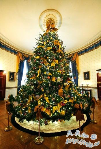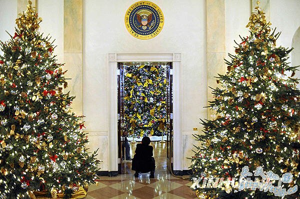 12月2日,美国首都华盛顿白宫的前厅装饰了圣诞树。当日,美国白宫2009年圣诞节装饰全部完成。来自美国24个州的92名志愿者耗时3400个小时参与完成了今年白宫的圣诞节装饰工作。