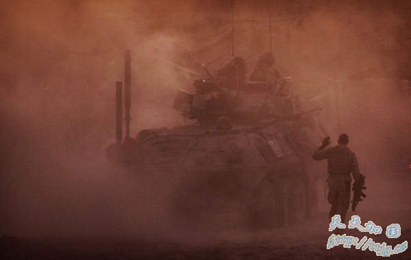 资料图片:当地时间2009年12月3日,阿富汗南部赫尔曼德省,一名美国海军士兵从第4轻型装甲侦察连的轻型装甲车旁走过。赫尔曼德省是这个国家主要的鸦片产区。而眼下,这个塔利班老巢也是阿富汗战争最激烈的前线。