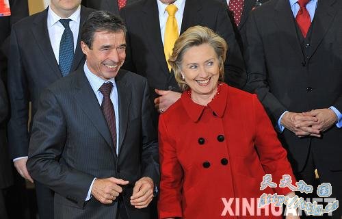 12 月4日,在比利时首都布鲁塞尔的北约总部,北约秘书长拉斯穆森(左)和美国国务卿希拉里·克林顿参加北约外长会议期间合影。北约秘书长拉斯穆森当天在布鲁塞尔宣布,已有至少25个国家承诺在2010年向阿富汗增派7000名左右的士兵,以支持北约在阿富汗的行动。 新华社记者武巍摄