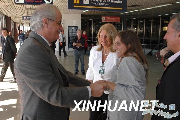 2008年1月4日,在阿根廷布宜诺斯艾利斯国际机场,刚刚获释的阿根廷护士皮拉尔·包萨·莫雷诺(左三)受到阿根廷外交部长塔亚纳(左一)和她父母的迎接。去年底在索马里东北部蓬特地区被武装人员绑架的莫雷诺和一名西班牙医生于1月2日安全获释。新华社发