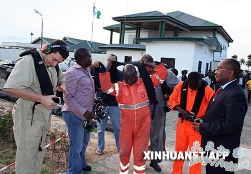 资料图片:2007年10月22日,在尼日利亚南部尼日尔河三角洲地区被武装人员绑架的7名石油工人获释,其中几名获释人质准备乘坐直升飞机离开。尼日尔河三角洲解放运动武装人员21日上午袭击了壳牌公司设在巴耶尔萨州的海上油田,绑架了包括3名外籍工人在内的7名石油工人。 新华社/法新