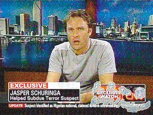 加斯帕看到奥马尔膝上盖的毯子正在冒烟,他立即掀开毯子对穆塔拉布搜身,此时他才注意到,穆塔拉布的裤子已经被拉开,而他裆部附近的左腿上捆着一个貌似小型白色洗发剂瓶,并正在燃烧。加斯帕顾不得许多,一把将那团正蹿着火苗的东西扯下,并大声呼喊其他人来救火。加斯帕称,当时穆塔拉布整条腿都在燃烧,裤子已经被烧破,如同一个“火人”!